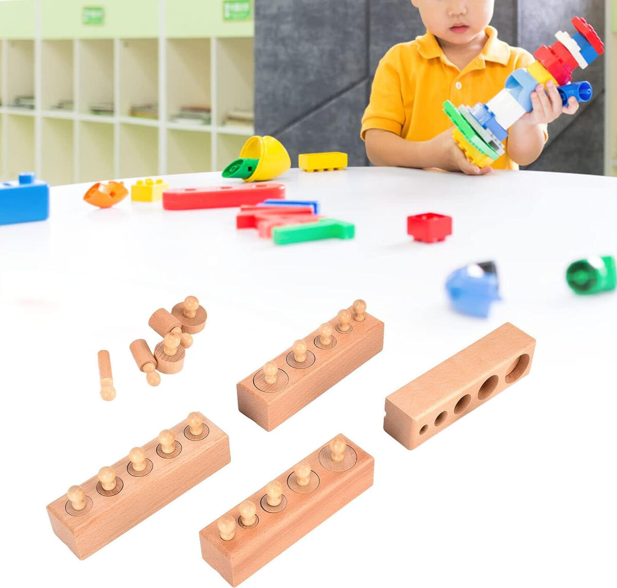 Product Name: Knobbed Cylinder Socket Wooden Educational ToyMaterial: Natural woodColor: Natural wood finishDesign: Ladder-style cylindrical socket with knobbed cylindersPieces Included: Multiple wooden cylinders with easy-grip knobsFunction: Size recognition, sorting, and matching